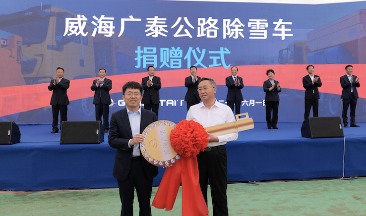 2021年6月威海廣泰高端應急救援保障裝備制造基地奠基儀式捐贈臨港區(qū)政府兩臺高端公路除雪車